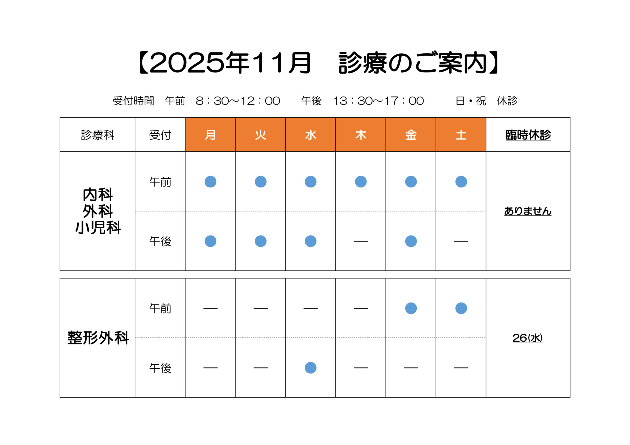 診療科目外科、内科、小児科、整形外科、リハビリテーション科(各科の診療予定については下のリンクよりご確認ください。)